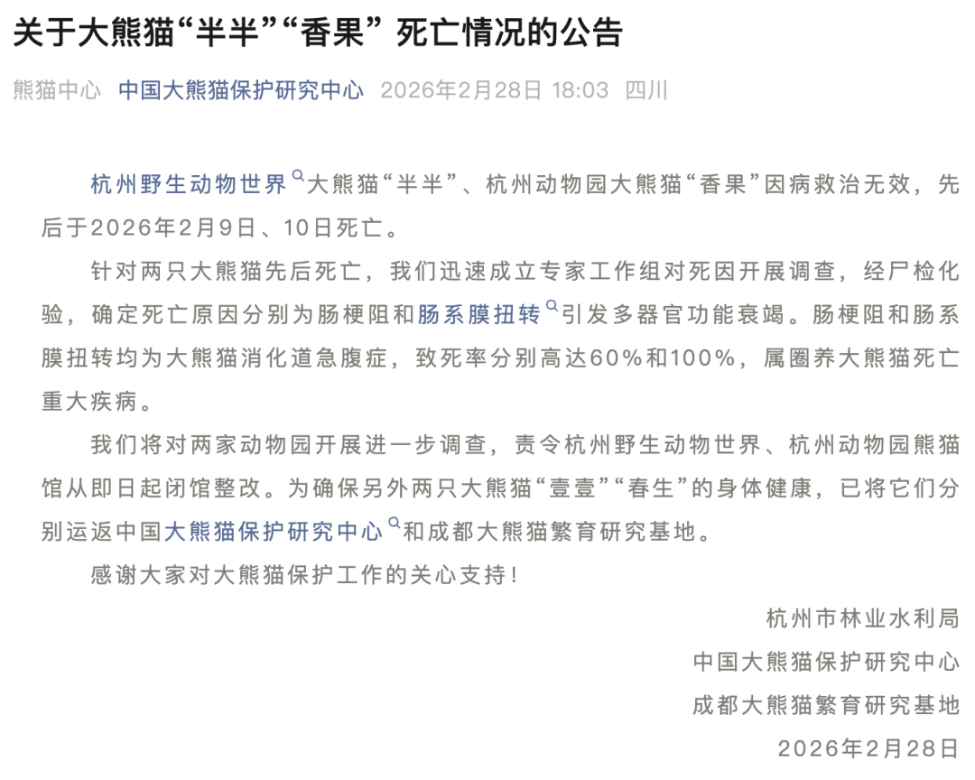 杭州野生动物世界大熊猫“半半”、杭州动物园大熊猫“香果”因病救治无效,先后于2026年2月9日、10日死亡。