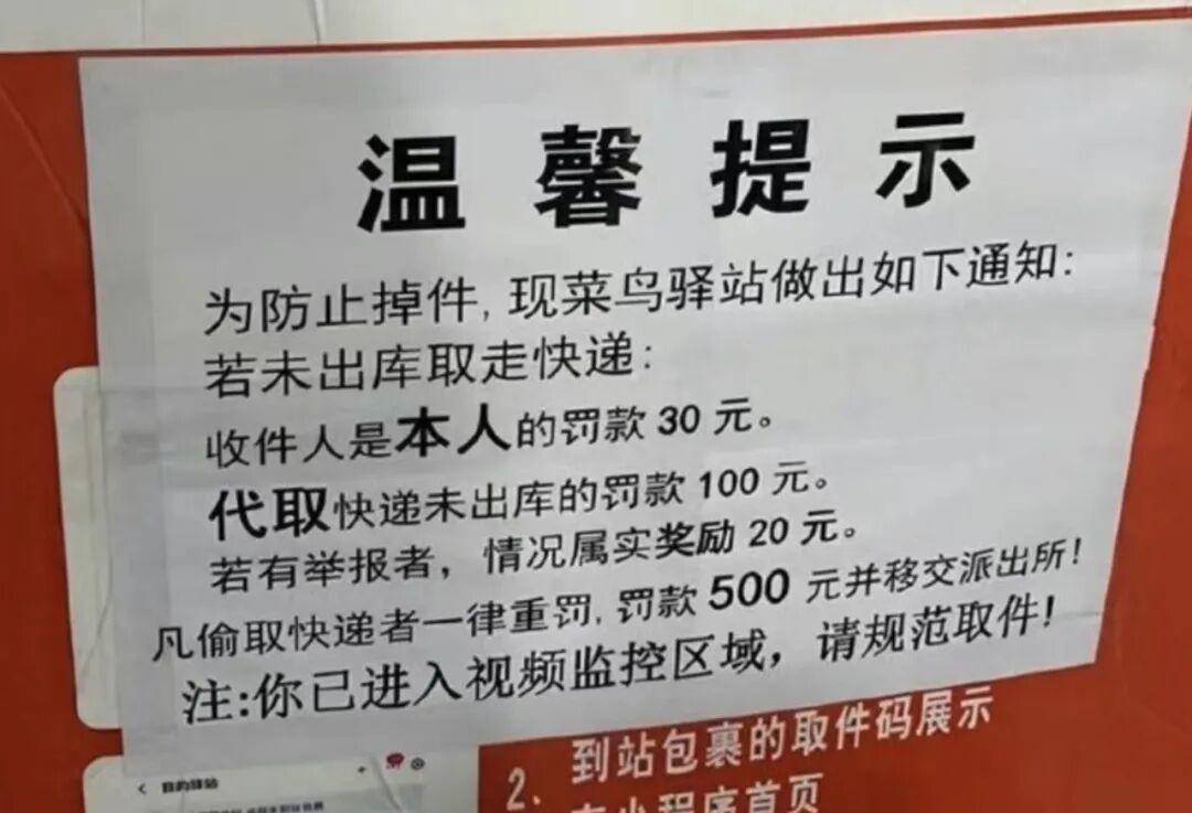 该“温馨提示”称:为防止掉件,未出库取走快递的将被罚款30至100元不等,举报属实者可获奖20元。