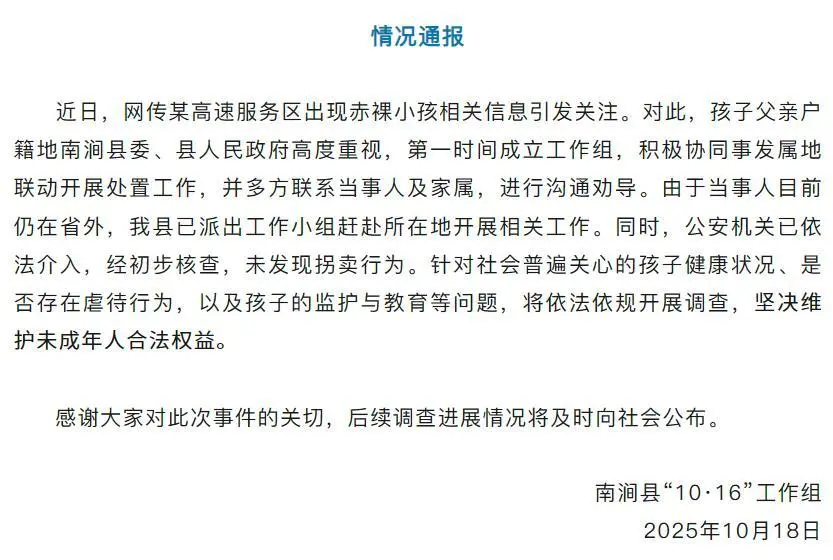 近日,“某高速服务区出现赤裸小孩”一事持续引发关注,相关话题多次登上热搜。