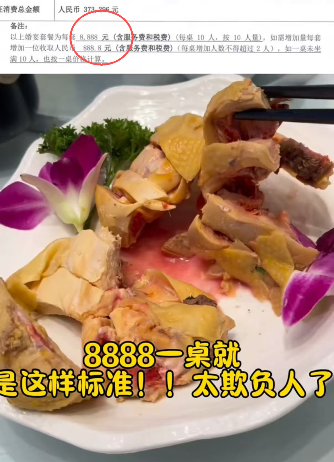从网友发布的视频中可以看到,此次婚宴套餐定价为8888元(含服务费和税费)(每桌10人,按10人量)。