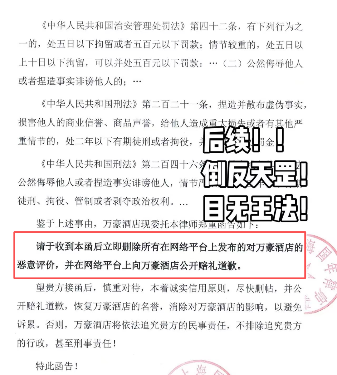10月22日,该网友再度发布视频更新事件进展,称收到上海中优城市万豪酒店发送的律师函。酒店方提出,对于网友和其朋友在大众点评上的不实恶意评论,要求发布者限期删除。律师函中写到:请于收到本函后立即删除所有在网络平台上发布的对万豪酒店的恶意评价,并在网络平台上向万豪酒店公开赔礼道歉。