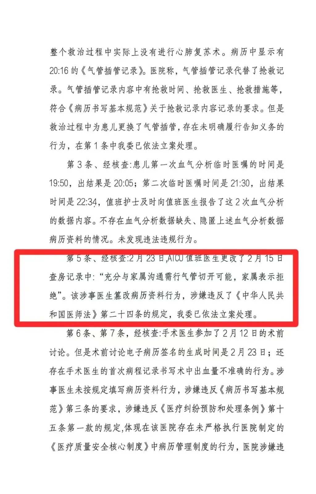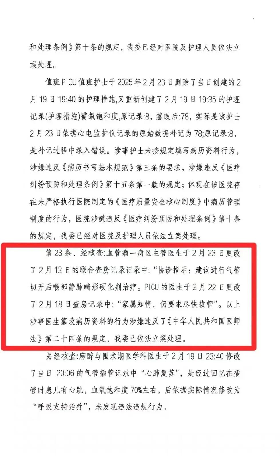 第23条显示,“经核查,⾎管瘤⼀病区主管医⽣于2⽉23⽇更改了2⽉12⽇的联合查房记录中:‘协诊指示:建议进⾏⽓管切开后喉部静脉畸形硬化剂治疗。’PICU的医⽣于2⽉22⽇更改了2⽉18⽇查房记录中:‘家属知情,仍要求尽快拔管’。以上涉事医⽣篡改病历资料的⾏为涉嫌违反了《中华⼈⺠共和国医师法》第⼆⼗四条的规定,我委已依法⽴案处理。”