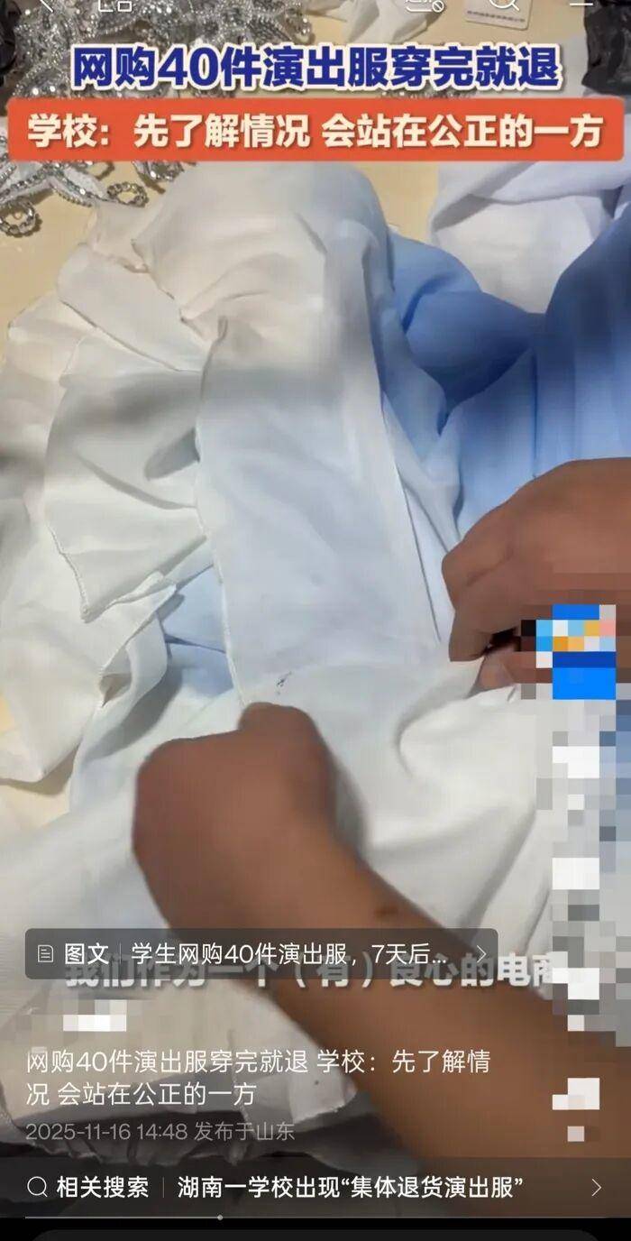 日前,湖南常德汉寿县一学校学生被曝网购40件演出服,演出结束后集体退货退款,却由商家承担无法二次销售的损失。11月17日,汉寿县委宣传部回应新黄河记者称,当地教育部门已介入调查。有律师分析称,如果校方知情默许,需和学生一起承担连带赔偿责任。