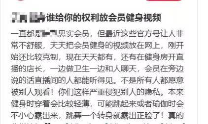 近日,有网友在社交平台发帖控诉,某连锁健身房部分门店的官方账号,未经会员同意便发布健身视频,还在健身房内直播。网友认为,健身时着装本就较为轻薄,瑜伽、舞蹈等项目的动作幅度又大,很容易在镜头下暴露隐私,这种行为侵犯会员个人隐私。