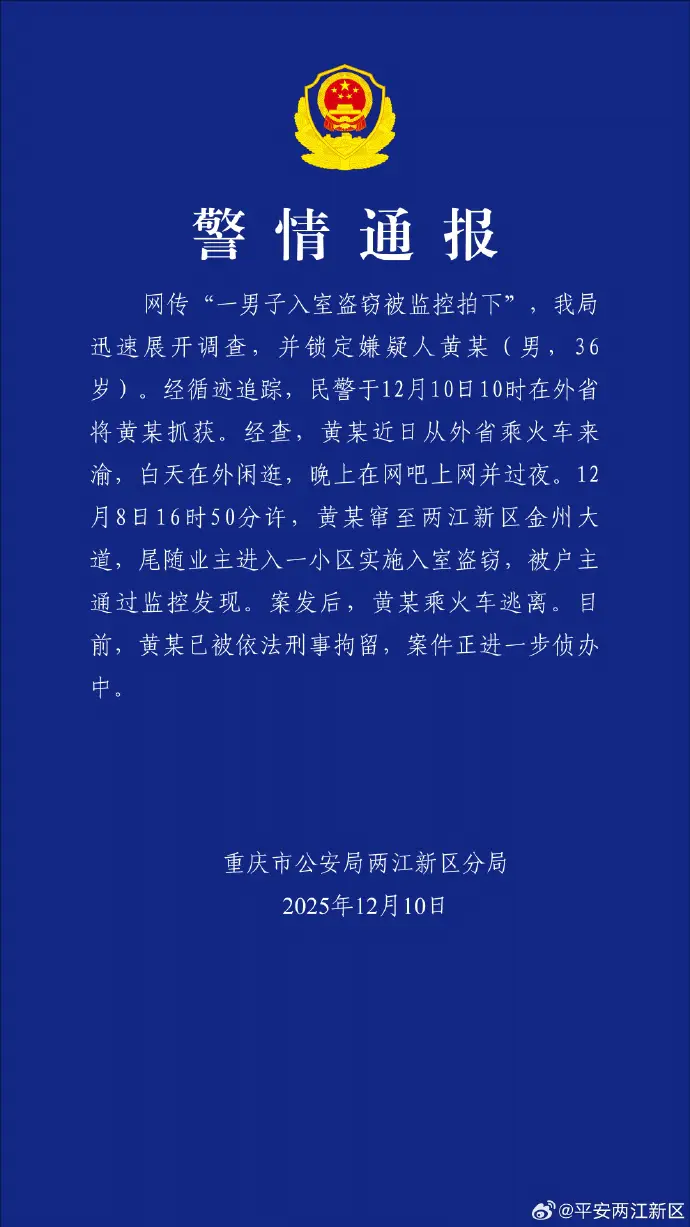 12月10日,@平安两江新区就此发布了警情通报。通报称,网传“一男子入室盗窃被监控拍下”,我局迅速展开调查,并锁定嫌疑人黄某(男,36岁)。经循迹追踪,民警于12月10日10时在外省将黄某抓获。经查,黄某近日从外省乘火车来渝,白天在外闲逛,晚上在网吧上网并过夜。12月8日16时50分许,黄某窜至两江新区金州大道,尾随业主进入一小区实施入室盗窃,被户主通过监控发现。案发后,黄某乘火车逃离。目前,黄某已被依法刑事拘留,案件正进一步侦办中。