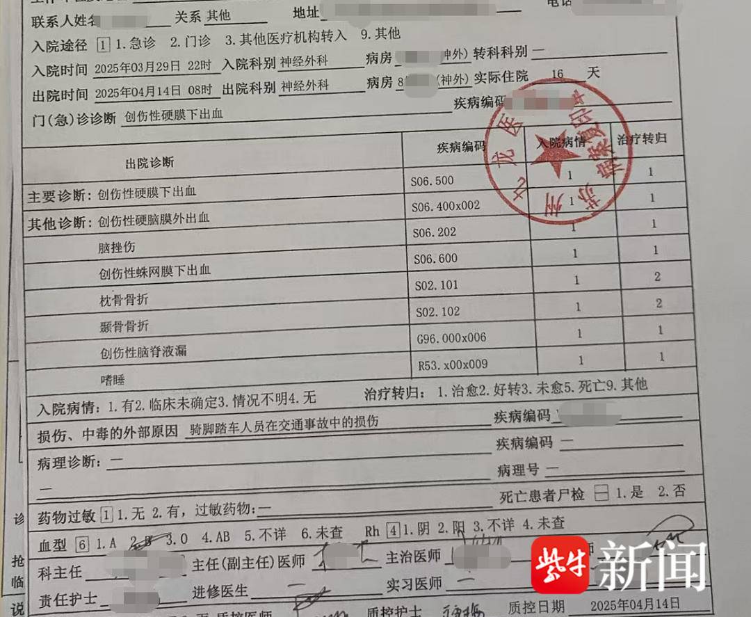 小张告诉扬子晚报/紫牛新闻记者,事情回溯到2025年3月29日晚,他下班途中遭遇车祸。对方转弯未让直行,负事故全部责任。经医院诊断,小张枕骨骨折、蛛网膜下腔出血,病情危急,一度面临开颅手术。