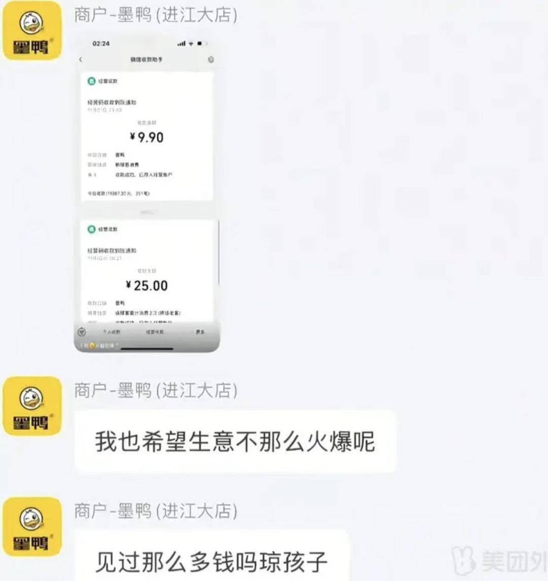 在该店铺的外卖平台(注:外卖平台只有下单才可评价),有买家留言称遭到商家攻击:商家晒出了收款9.9元和25元的截图,并表示,“我也希望生意不那么火爆呢,见过那么多钱吗孩子,一个月生活费有500吗够花吗”还有买家在今年8月称,“4个鸭爪,1个鸭爪还变鸡爪了,鸭爪(点)的是五香的,给的是辣的小朋友没法吃”、有买家在今年7月评价“我要的是甜辣的,没有甜辣的你可以说一声,全给13香的”、有买家在今年3月评价“付了钱还不给我打包好,打包盒呢?”……目前,该店铺在外卖平台已显示打烊。