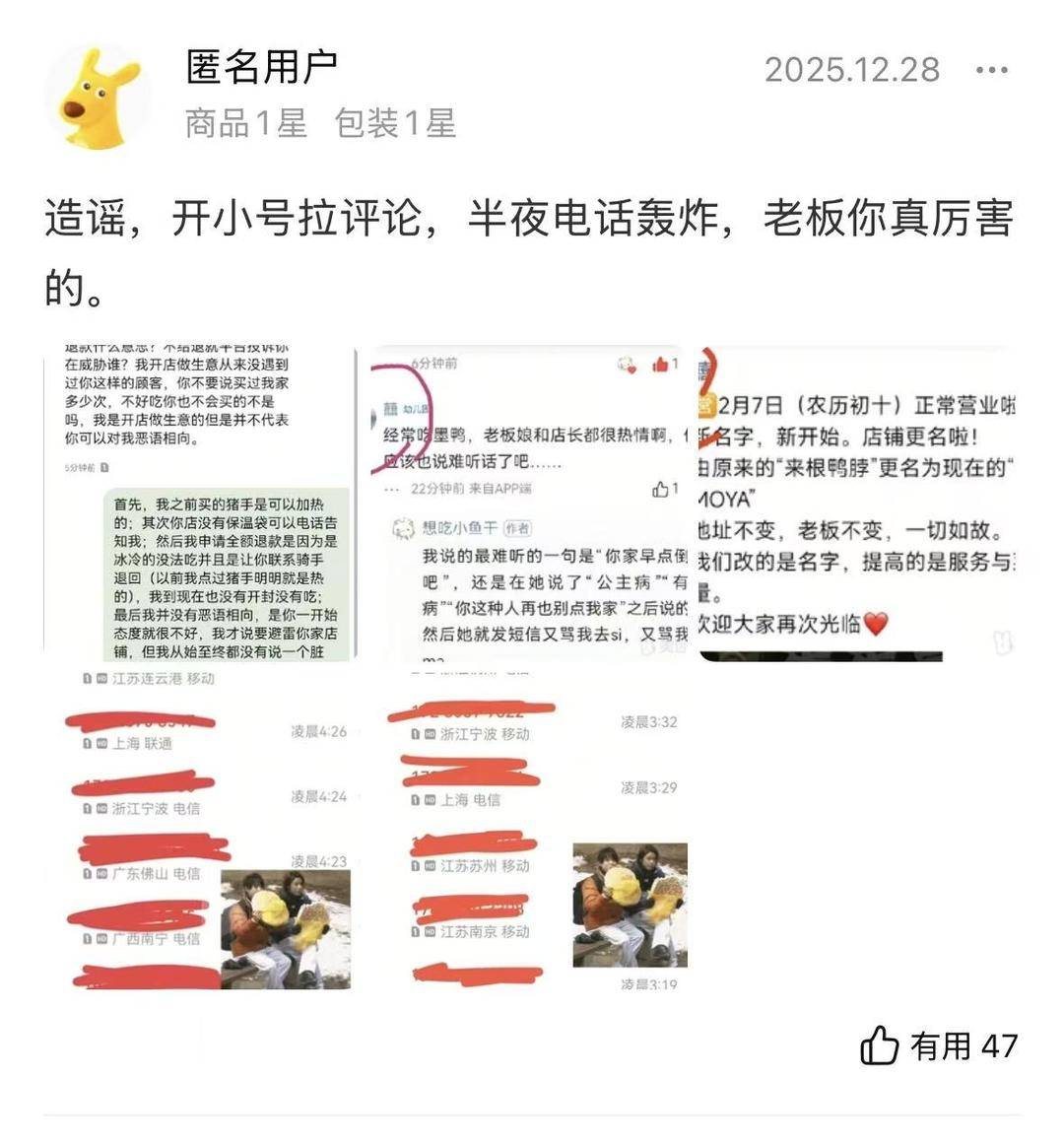 扬子晚报/紫牛新闻记者在点评平台搜索该店铺,发现门店仅有4条评价,页面显示“该商户新增部分与体验无关的评论”,点开显示大量差评,有网友评论,“下次不敢点了,怕他发短信骂我”、“早点倒闭吧”、“令人气愤”。还有网友写下了“推荐菜单”:“嘴臭鸭脖”、“不卖学生卤猪蹄”……