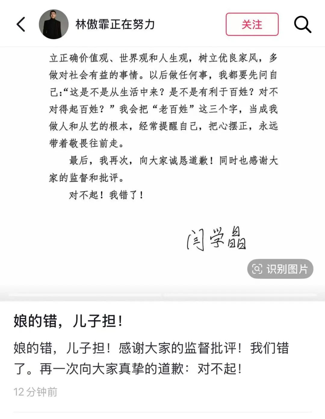 1月12日,闫学晶儿子林傲霏转发母亲道歉内容称:娘的错,儿子担!感谢大家的监督批评!我们错了。再一次向大家真挚的道歉:对不起!。