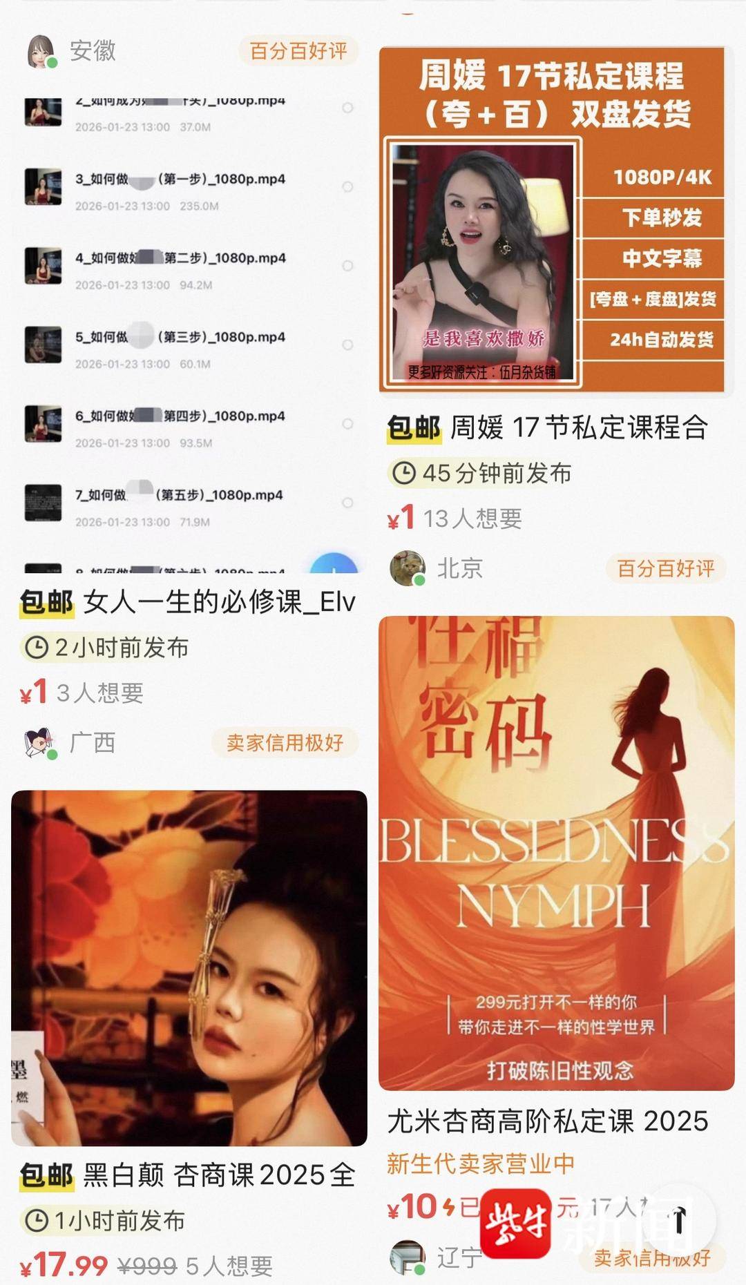 该小程序1月22日晚上还能查阅,23日一早显示因违规被封停。在一些社交平台,周媛的主账号被封,但其粉丝不多的小号仍有内容存在,“黑白颠性商学院”旗下的其他导师也有账号,发布同样性感露骨的内容。记者搜索发现,目前二手平台已开始售卖“黑白颠”二手网课,价格从几块钱到几十块钱不等。记者询问卖家后,对方表示是从网上整理所得,“不是正版,是录播,正版的要9999元,但内容是一样的,不满意可退。”