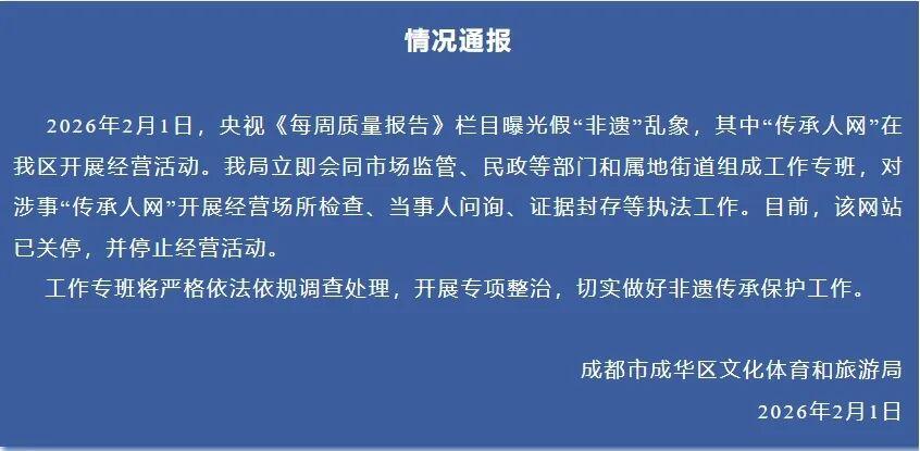 2月1日晚,成都市成华区文化体育和旅游局发布情况通报称,2月1日,央视《每周质量报告》栏目曝光假“非遗”乱象,其中“传承人网”在成华区开展经营活动。该局立即会同市场监管、民政等部门和属地街道组成工作专班,对涉事“传承人网”开展经营场所检查、当事人问询、证据封存等执法工作。目前,该网站已关停,并停止经营活动。工作专班将严格依法依规调查处理,开展专项整治,切实做好非遗传承保护工作。