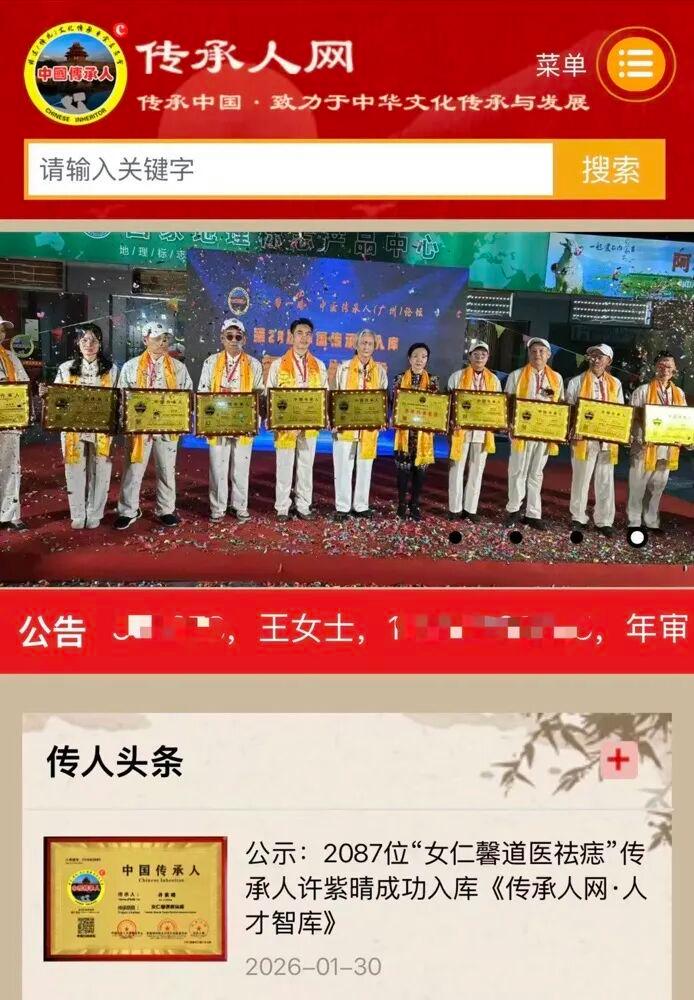 记者登录该网站,发现网站公示了100多页的“传承人”证书,有“祛痣技艺”传承人、“手工肉丸制作技艺”传承人等。网站公示的“传承基地”有9页,其中包含多个以人名为头衔的工作室,以及文化传播、茶业、美容公司。