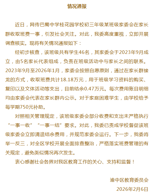 2月6日下午,重庆市渝中区教育委员会对此发布了情况说明。渝中区教育委员会称,近日,网传巴蜀中学桂花园学校初三年级某班级家委会在家长群收取班费一事,引发社会关注。对此,渝中区教育委员会高度重视,立即开展调查核实。经初步核查,该班级共有学生46名,其家委会于2023年9月成立,由5名家长代表组成,负责在班级活动中与家长之间的联系。2023年9月至2026年1月,家委会按照自愿原则,通过在家长群接龙的方式,收取班费共计18.18万元,用于班级学习资料的购买、复印以及文体活动等支出,目前结余0.47万元。每次费用账目明细均由家委会代表在家长群内公示。对于家庭困难学生,由学校给予每学期750元补助。