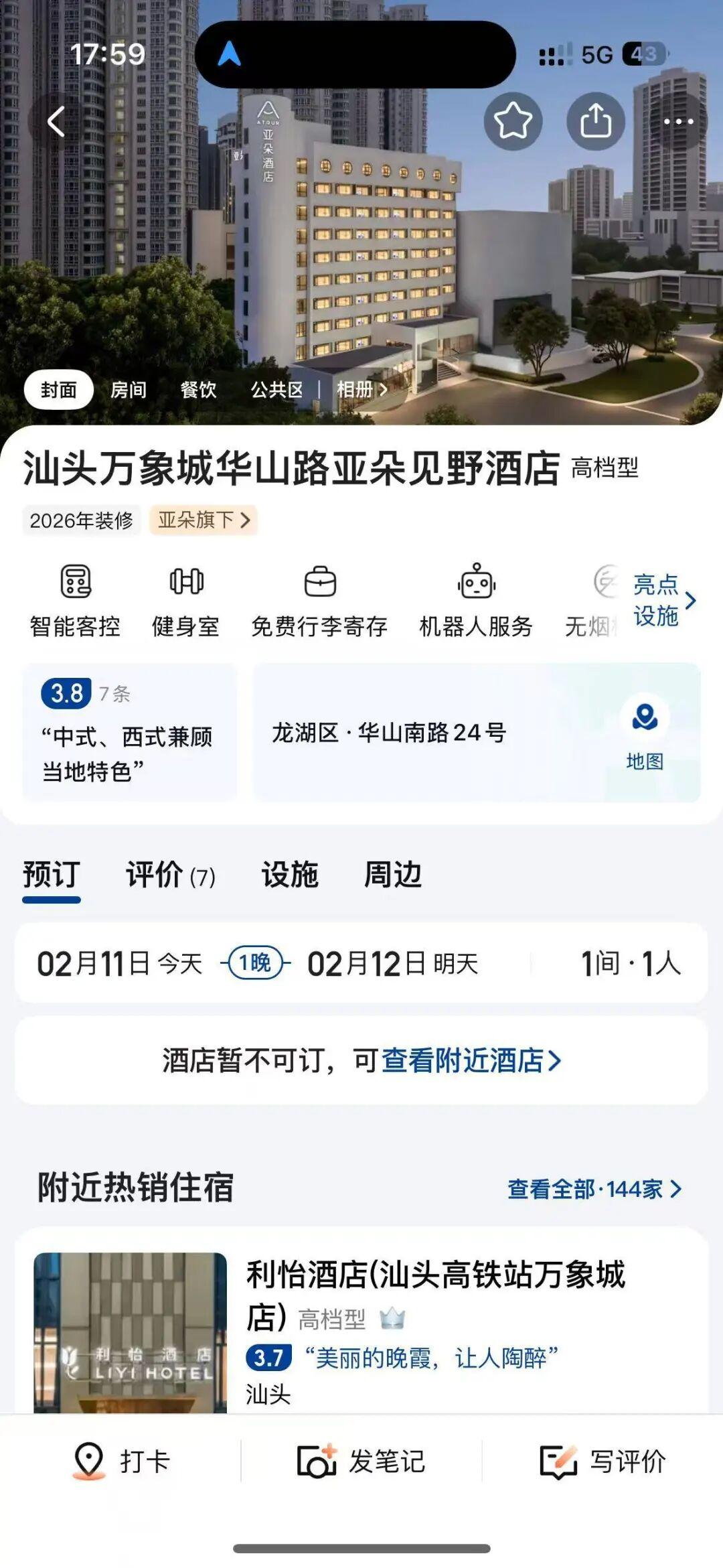 近日有网友反映,春节期间广东汕头酒店普遍涨价,平时720元左右的汕头万象城亚朵酒店深睡尊享大床房,春节价格涨至4221元。“汕头4200元一晚的亚朵已订满”等词条登上热搜。