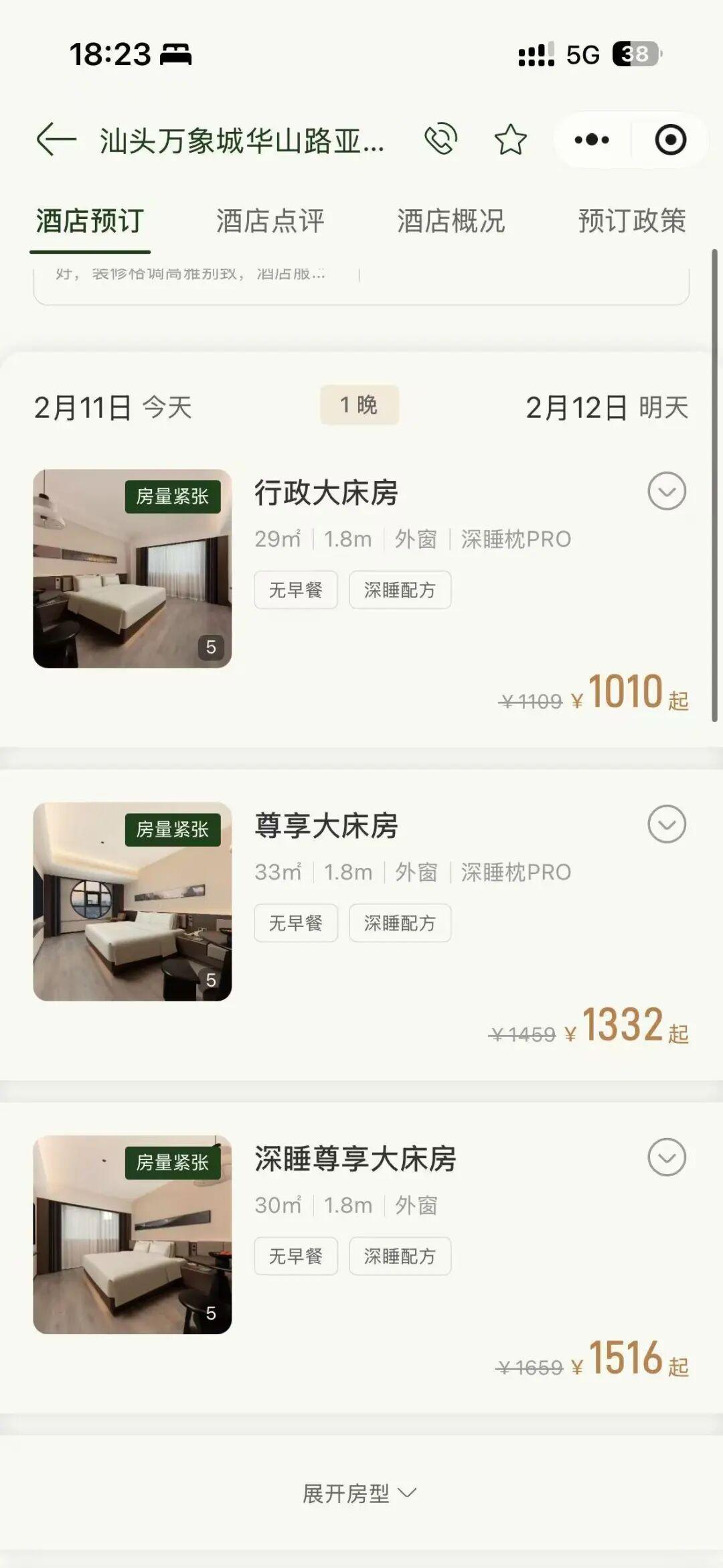 2月11日,极目新闻记者致电汕头万象城亚朵酒店,工作人员称11日当天有房间可订,深睡尊享大床房门市价格为1650元,其不了解媒体报道的该房型4200元一晚的情况。记者查询亚朵官方小程序看到,深睡尊享大床房价格为1516元,此外该酒店还有行政大床房和尊享大床房可供预订,价格分别为1010元和1332元。