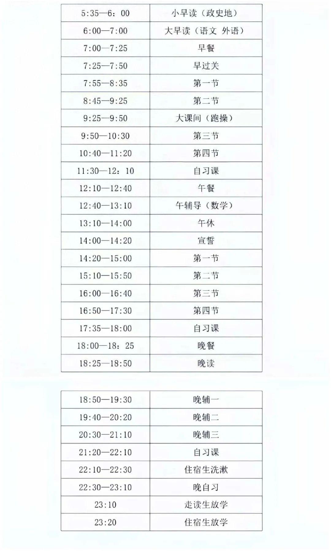 网传作息表截图显示,从早上5点35就要进行自习背书,早餐25分钟午餐30分钟晚餐25分钟,午休30分钟,宣誓20分钟,其余时间基本都在上课,22点住校生20分后洗漱完毕还要继续上晚自习至23点20,走读生上课到23点10分。