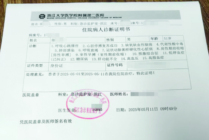 陈先生回忆,2025年4月27日,父亲向超市门店配送主管提出,5月1日要休息一天,却被明确拒绝了休假申请。5月1日当天,父亲正常上岗,上午9点半左右在配送过程中在小区电梯内突然晕倒。急救人员赶到后将其送往浙医二院滨江院区抢救,确诊为呼吸心跳骤停、心脏停搏复苏成功、缺氧缺血性脑病、肺部感染、糖尿病、高血压等。至今处于昏迷状态。