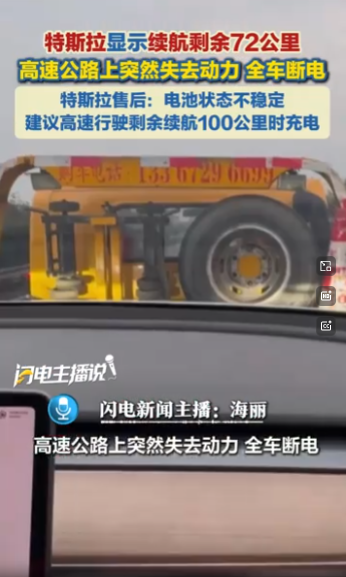 2月7日晚,车主陈女士驾驶一辆2022款特斯拉Model Y在浙江高速公路上行驶。在表显续航剩余约72公里、距离嵊州服务区仅剩约2公里时,车辆突然失去动力并全车断电,连危险警告灯都无法打开。事发后,特斯拉售后将原因初步归结为“电池状态不稳定”,并建议车主“高速行驶时应于剩余续航100公里时及时充电”。