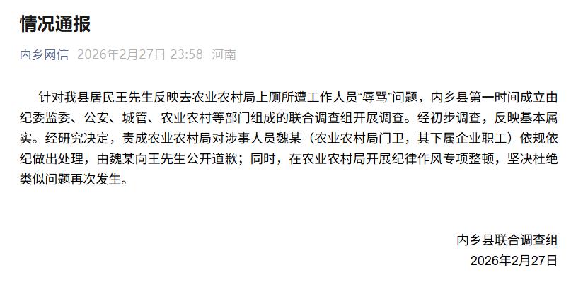 针对河南内乡县一居民在农业农村局上厕所遭工作人员“辱骂”一事,2月27日,河南省南阳市内乡县联合调查组发布情况通报。