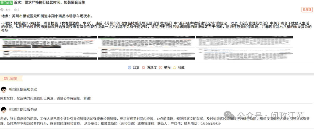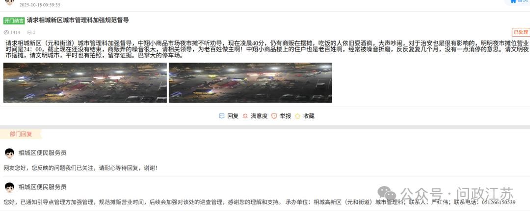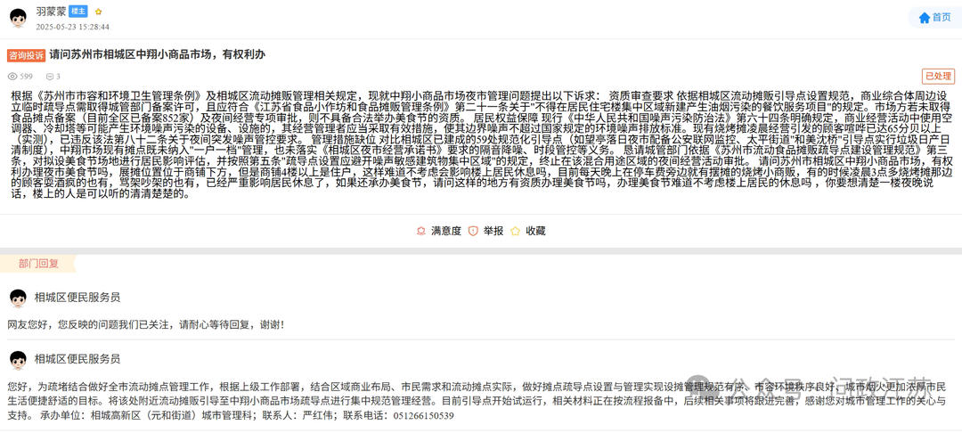 3月11日,苏州市相城区元和街道集成指挥中心回复,由于相城大道周边流动摊贩占道经营现象较为突出,存在一定安全隐患。元和街道经沟通协调,于2025年5月在相城大道中翔小商品市场停车场设置夜市引导点,明确经营时间为17:00至24:00。但运营期间,部分摊点未遵守经营规定,超时经营、噪声扰民问题频发。尽管街道工作人员多次上门沟通,仍有部分摊点违规经营至凌晨两三点。